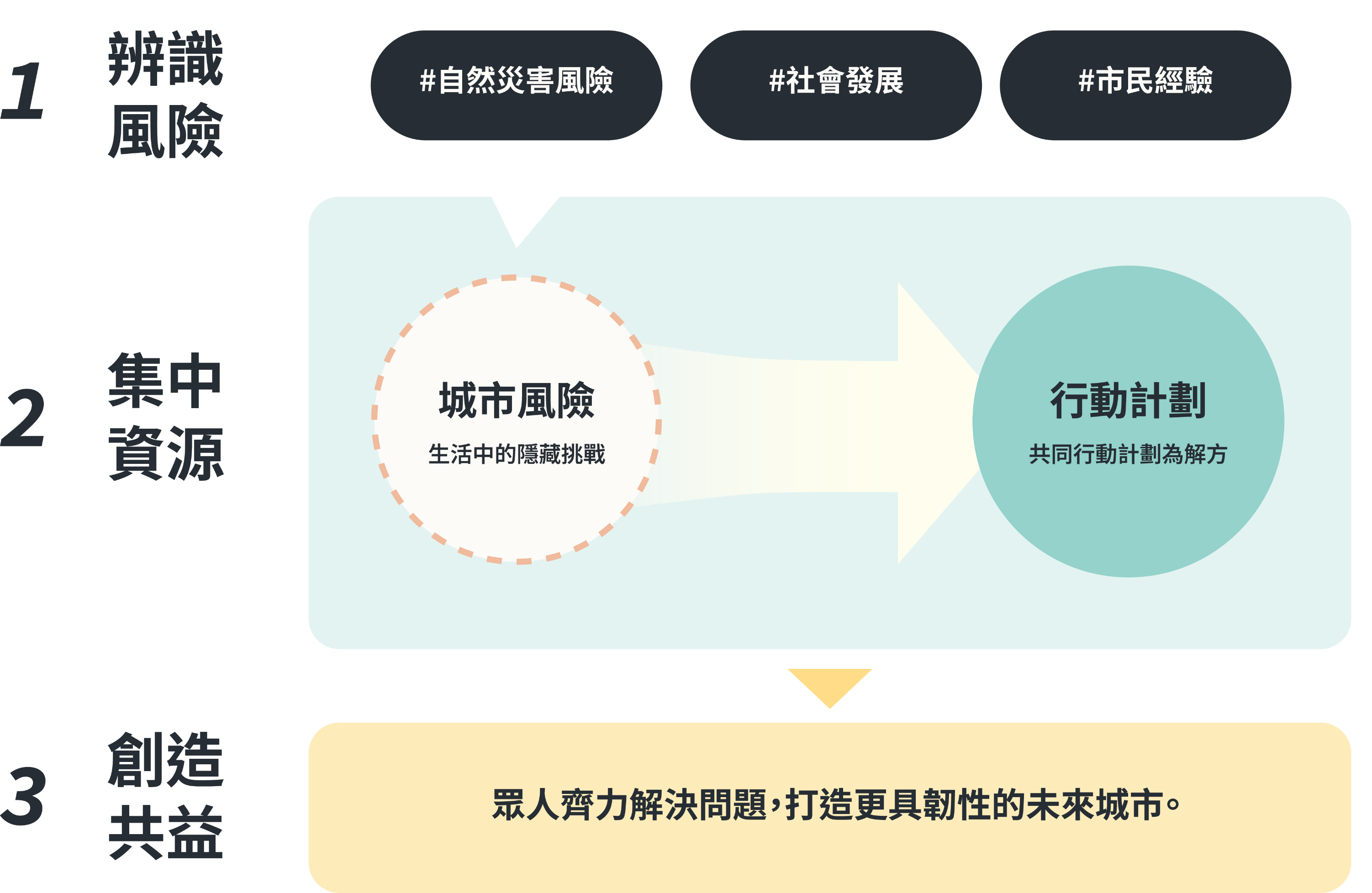 面對風險,我們串連政府、企業與民間的能量,設計跨部門的行動方案。從在地實踐到政策倡議,邀請市民一同參與。